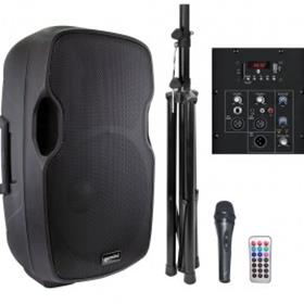 DIFFUSORE AMPLIFICATO A 2 VIE DA 300 W E 600 W DI PICCO – 50–20.000 HZ – TWEETER DA 1" – WOOFER DA 15" – 2 INGRESSI LINE CON REGOLAZIONE SEPARATA DEL VOLUME – 1 INGRESSO MICROFONICO CON REGOLAZIONE DEL VOLUME – MASTER GENERALE CON REGOLAZIONE SEPARATA DI ALTI E BASSI – INGRESSO BILANCIATO E SBILANCIATO – IN/OUT PER COLLEGAMENTI IN CASCATA – LETTORE USB ED SD CARD INTEGRATO – RICEVITORE BLUETOOTH PER COLLEGARE QUALUNQUE SORGENTE ESTERNA IN WIRELESS (BLUETOOTH) – IL LETTORE HA LE SEGUENTI FUNZIONI: PLAY/PAUSE/FFWW/REW OLTRE ALLO SKIP DELLA TRACCIA E ALLA FUNZIONE RANDOM PLAY – CABINET ULTRA LEGGERO IN ABS – 1 TREPPIEDE IN METALLO – 1 MICROFONO A MANO A FILO – TELECOMANDO IR PER LE FUNZIONI DEL DIGITAL PLAYER